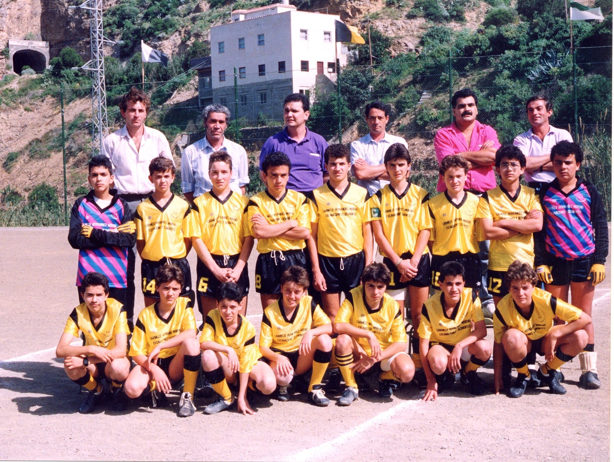 En el campo de fútbol “La Mancha”, integrantes de la directiva y jugadores infantiles del C. F. Vallehermoso, en una foto realizada al menos veinticinco años atrás.