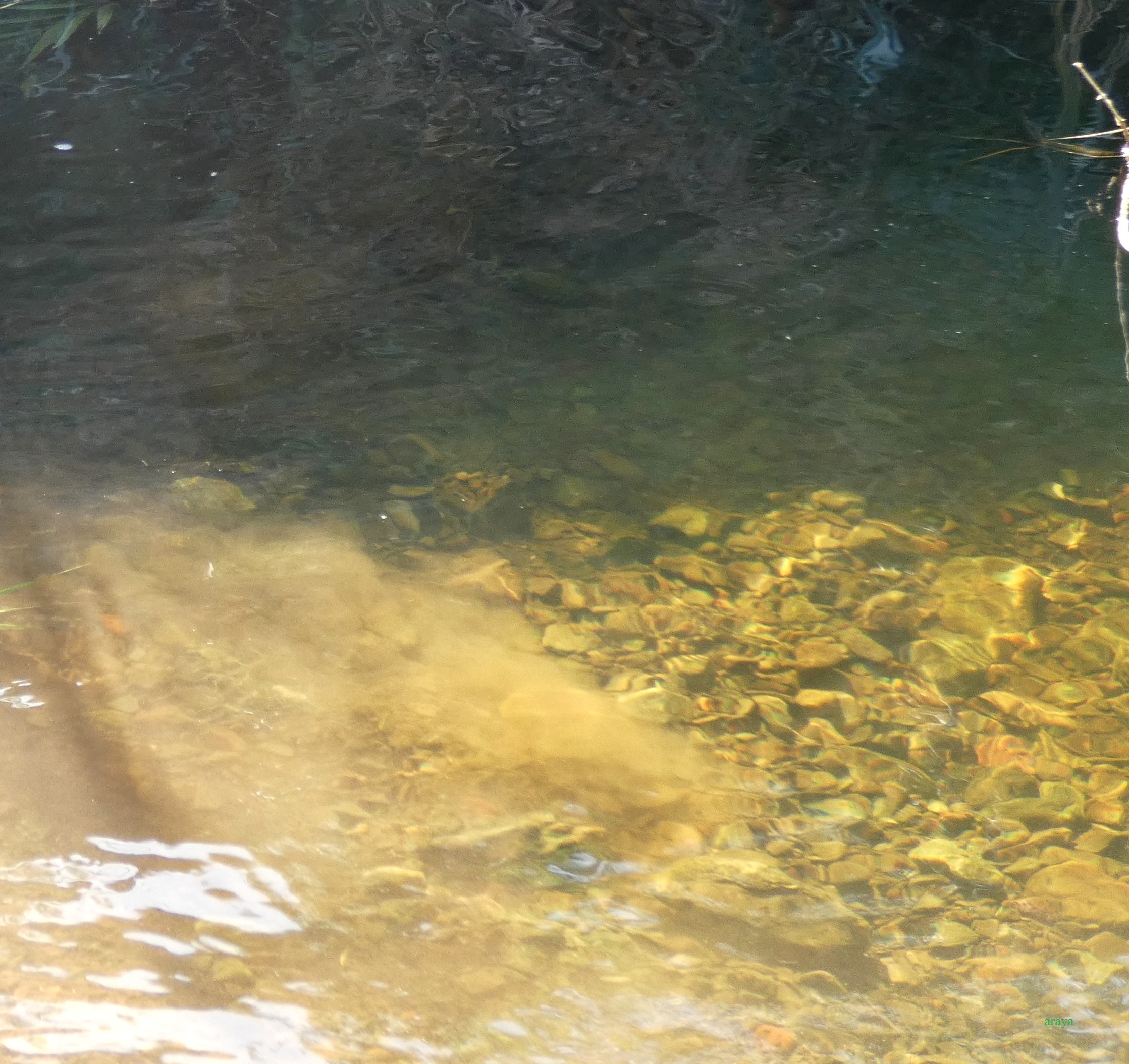 Encontramos la profundidad del charco bastante grande—unas cuantas yardas, en efecto—; su forma es la de un cono invertido con ranuras paralelas, que gracias a la diafanidad del agua se distinguían claramente, marcando capas en la toba de un rojo más ó menos subido.